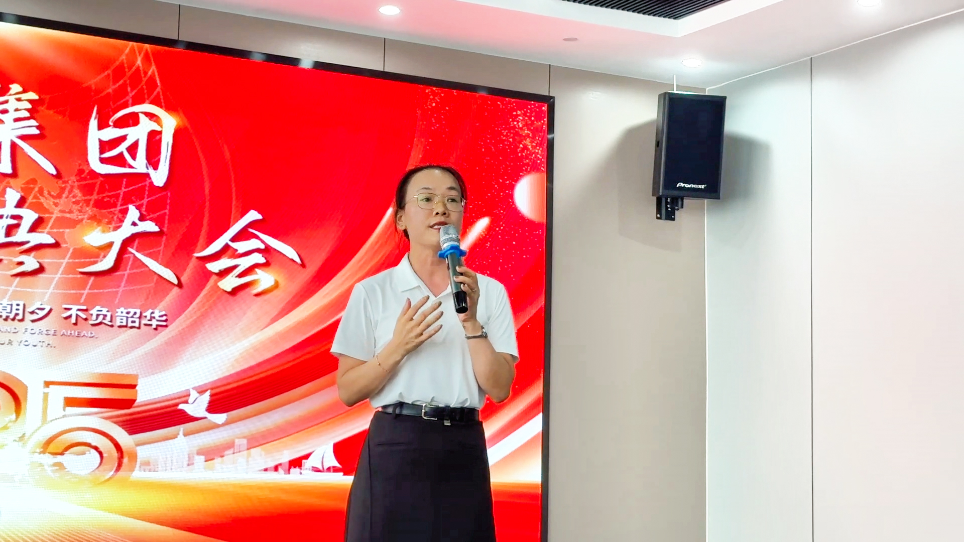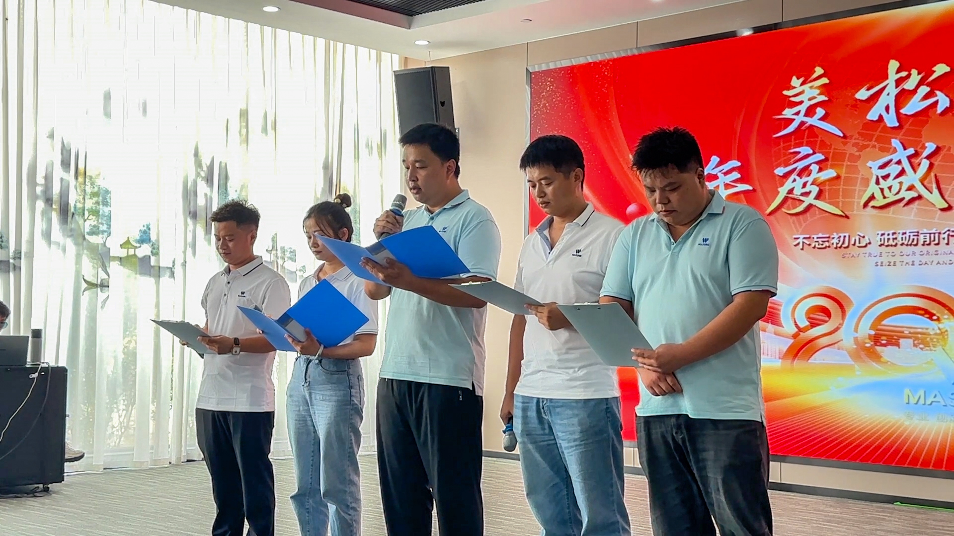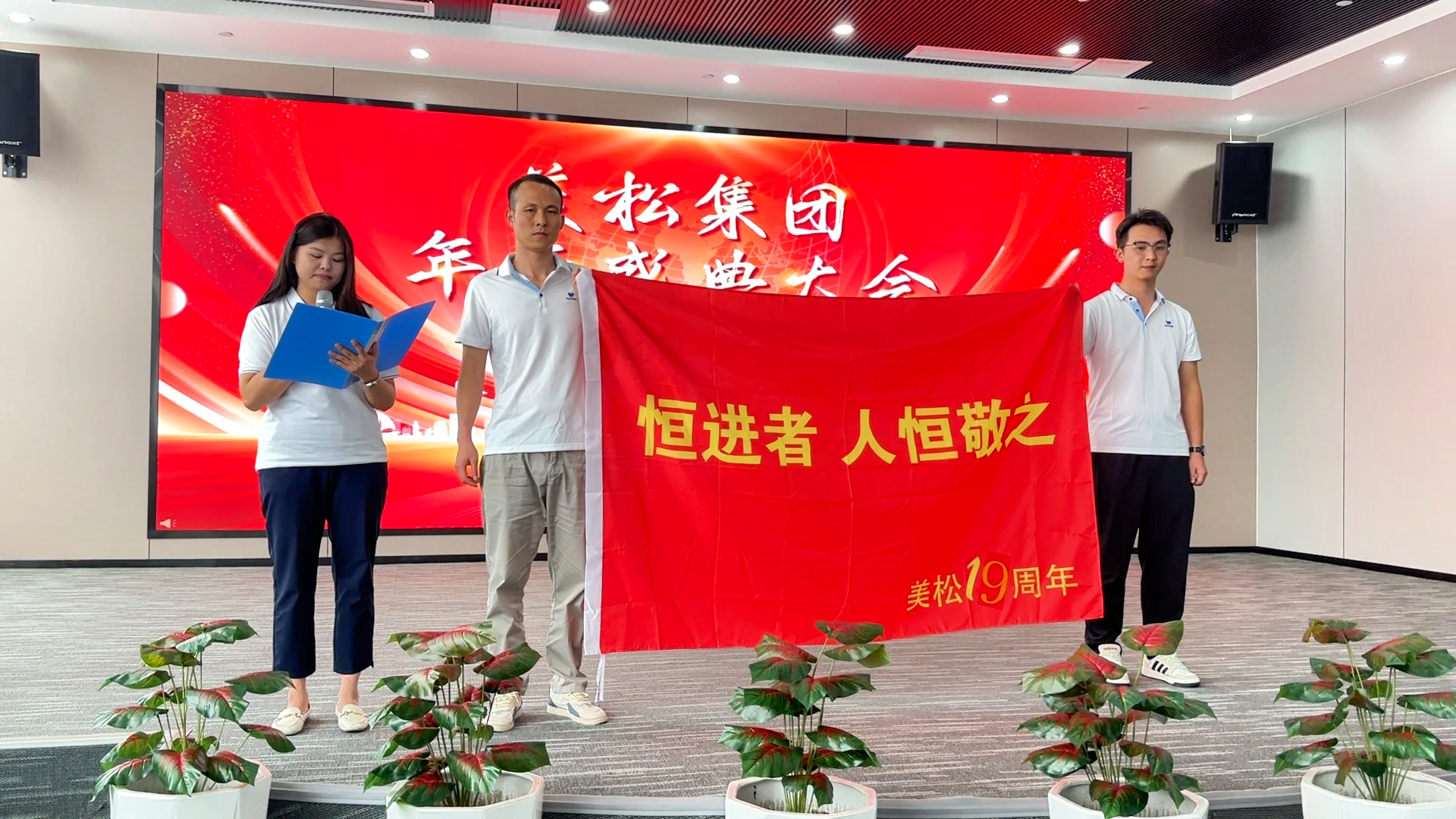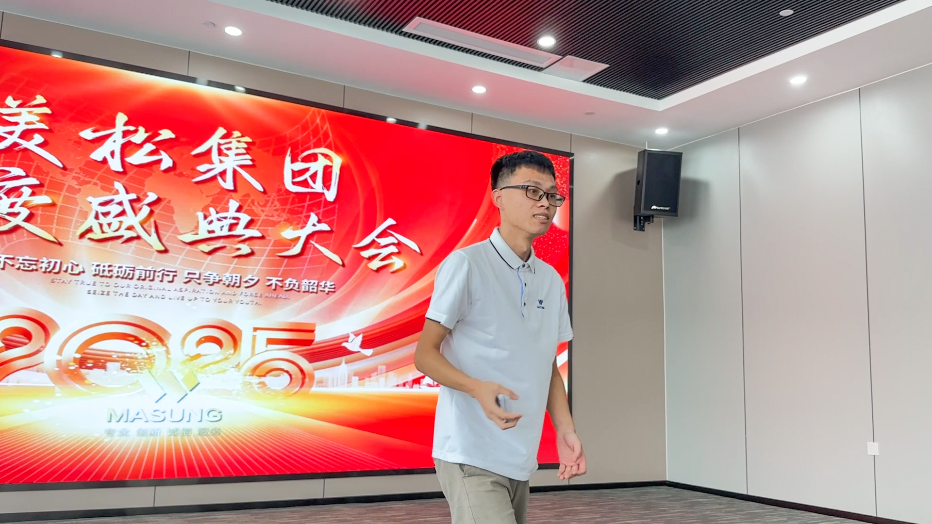 在第19个节目表演结束后评委紧张的打分间隙,舞台聚焦落在了美松集团总经办coco身上,她的成长故事更是点燃全场。这位在美松深耕15年的老员工,用归属感,价值感与成长空间与美松共生,这份荣誉与岁月的积淀,使她的发言格外具有穿透力。她以真诚的语气回顾自己从初入美松的青涩,到如今肩负重要管理职责的自信旅程;也见证了公司从10来人的团队发展至今,在行业内具有一定影响的力量;从点滴岗位成长到跨部门协同推进,从个人素养的持续提升到对公司愿景的坚定拥护,这些分享如同一面镜子,照见了无数同事的努力与坚持。她动情的从“责任、信任、情怀、坚定“四个维度展开与美松人的成长节点,也表达了对未来的无限期待。只有大家保持初心持续学习才能将美松masung品牌,美松的打印机产品,美松的完美服务带向新的高度!最动人心弦的一幕,是她对“认同感与共同成长”的真挚呼喊——愿越来越多的美松人愿意和她一样,认可美松、信任美松、与美松共同成长。当coco问起现场美松人,是否愿意跟她一样,与美松一起成长,5年,10年,20年,30年时,掌声雷动之中听到的都是回应声:“好”!