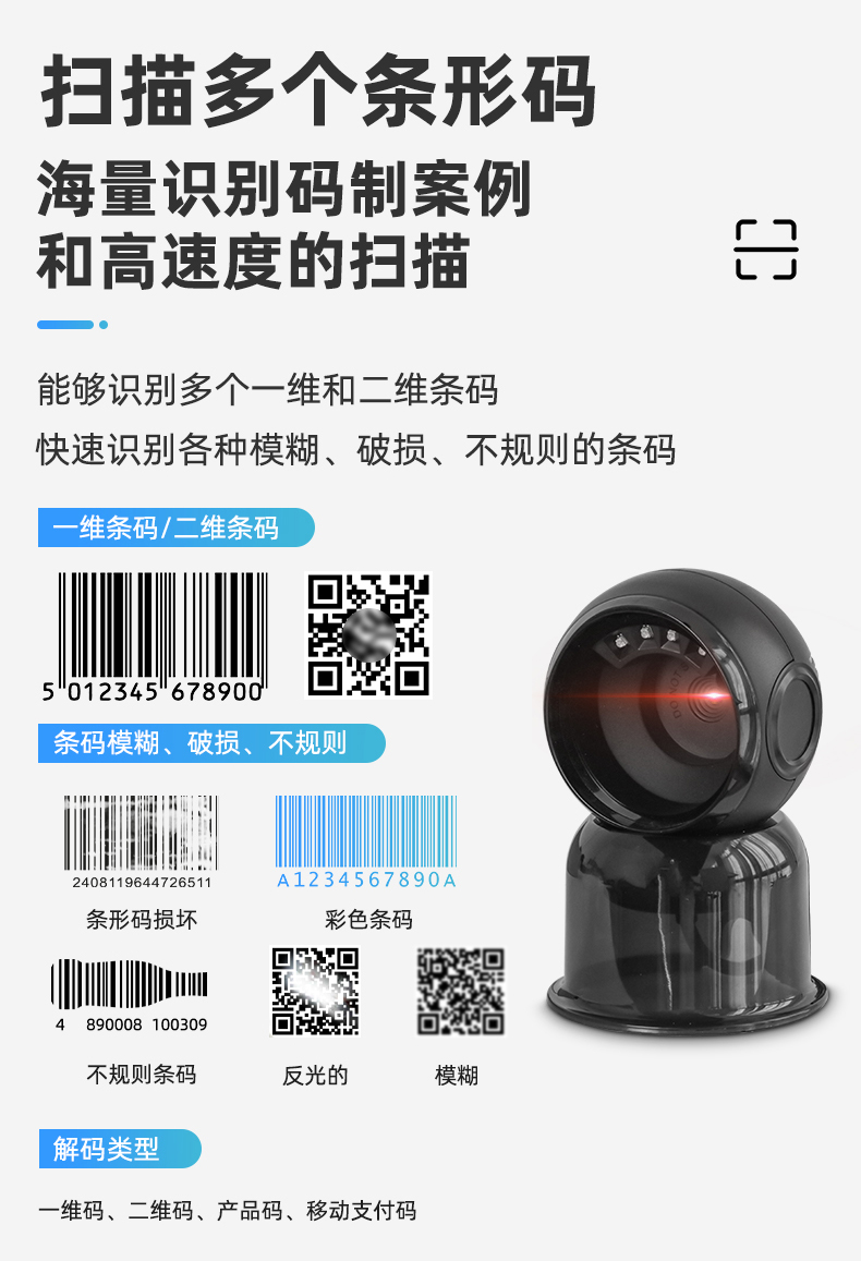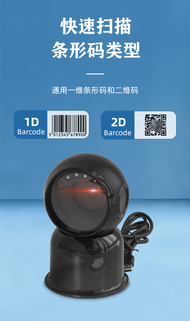 ms-7310_桌面扫码平台有线式 产品特点: 领先解码技术 采用自主研发的核心技术,极速响应, 支持快速开发和定制需求 高运动容差 采用全局曝光镜头搭配快速抓取技术,可实 现在运动过程中快速读取 褶皱残缺码优化 对褶皱和残缺条码进行算法优化,条码可识读率更高 纸质码/手机码流畅切换 商品码纸质码和手机支付码间自动切换,流畅高效 应用场景: 新零售、检票、医疗等桌面设备。尤其适合零售商品码和其他高密、反光、残缺、褶皱条码的运动中读取。